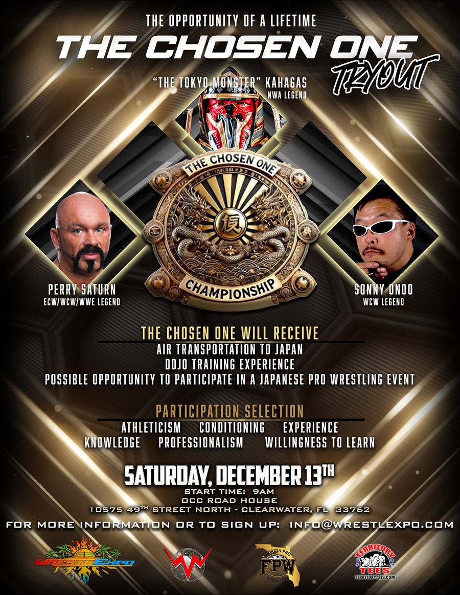 The tryout will be hosted by ECW, WCW and WWE Legenc Perry Saturn, WCW Legend Sonny Ono, and NEW Legend "Tokyo Monster" Kahagas. The tryout is open to both men and women.